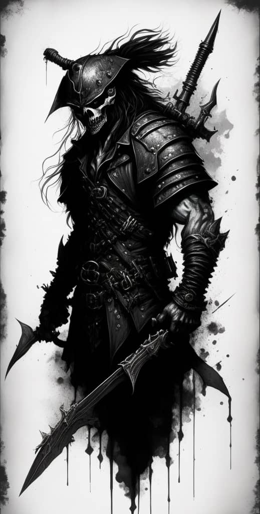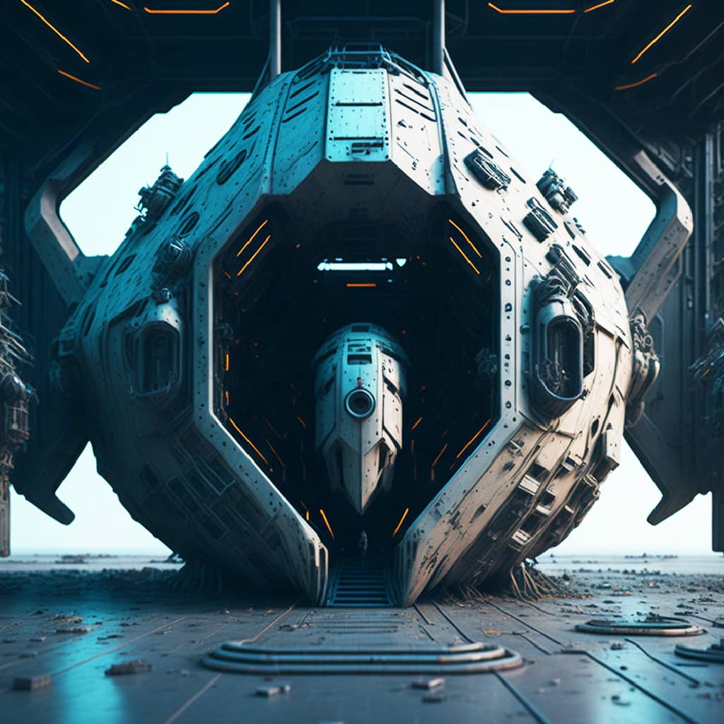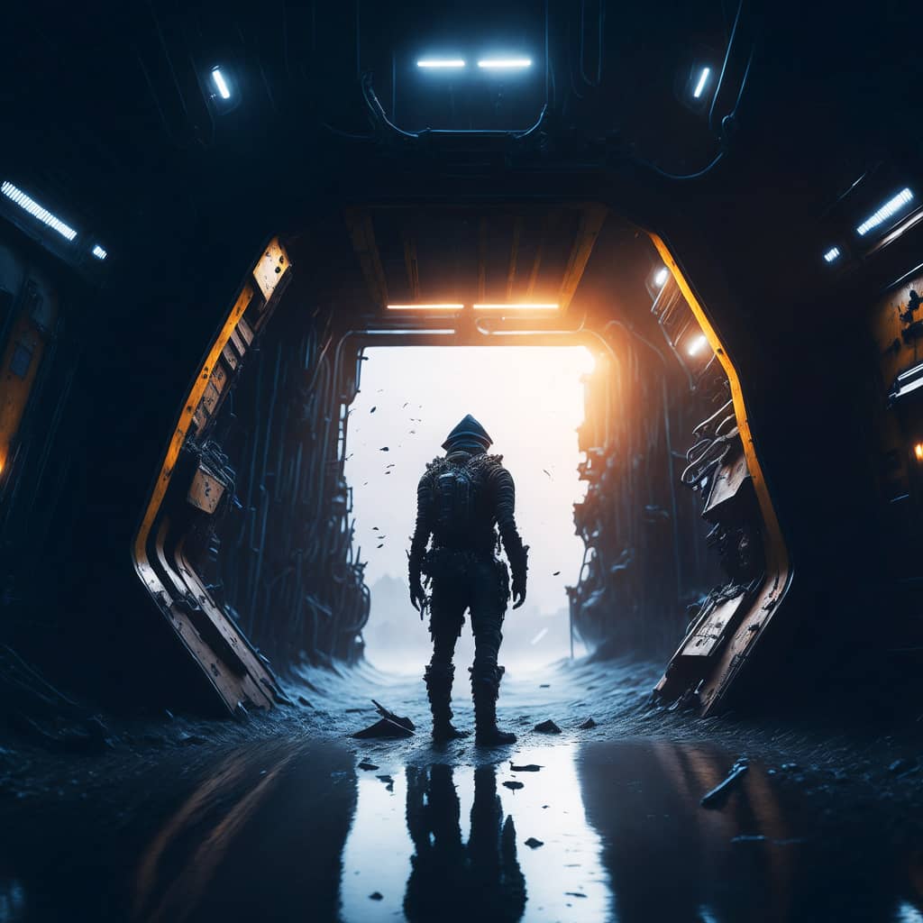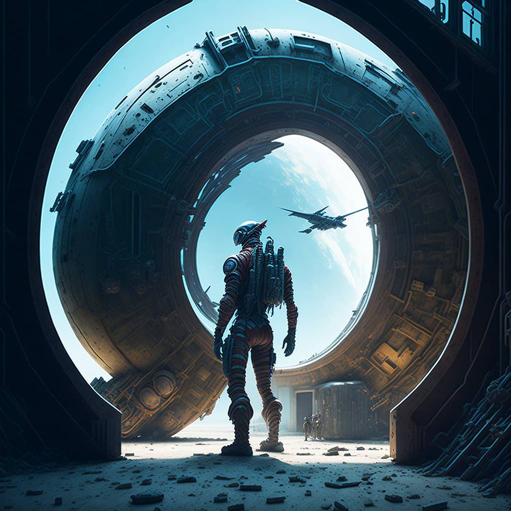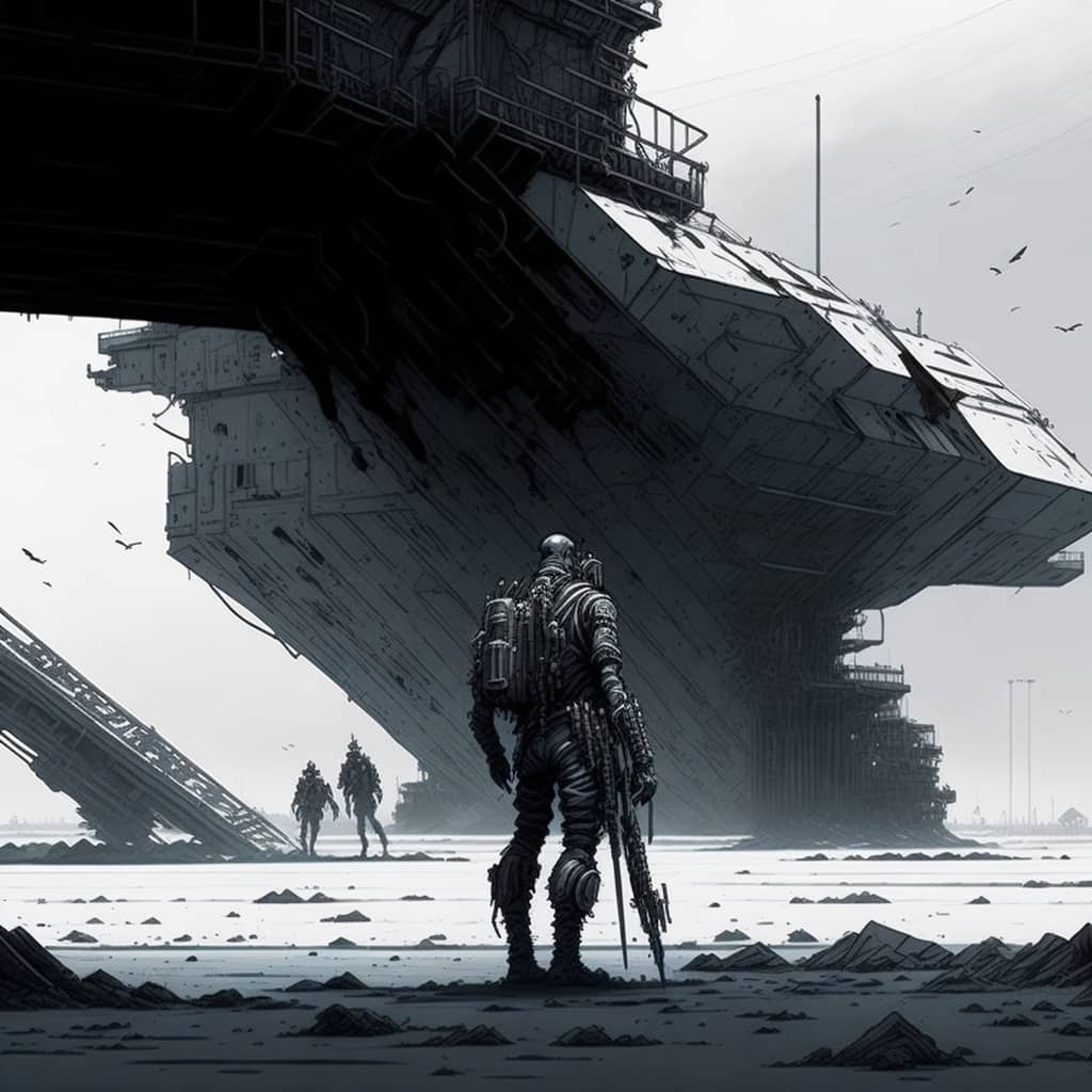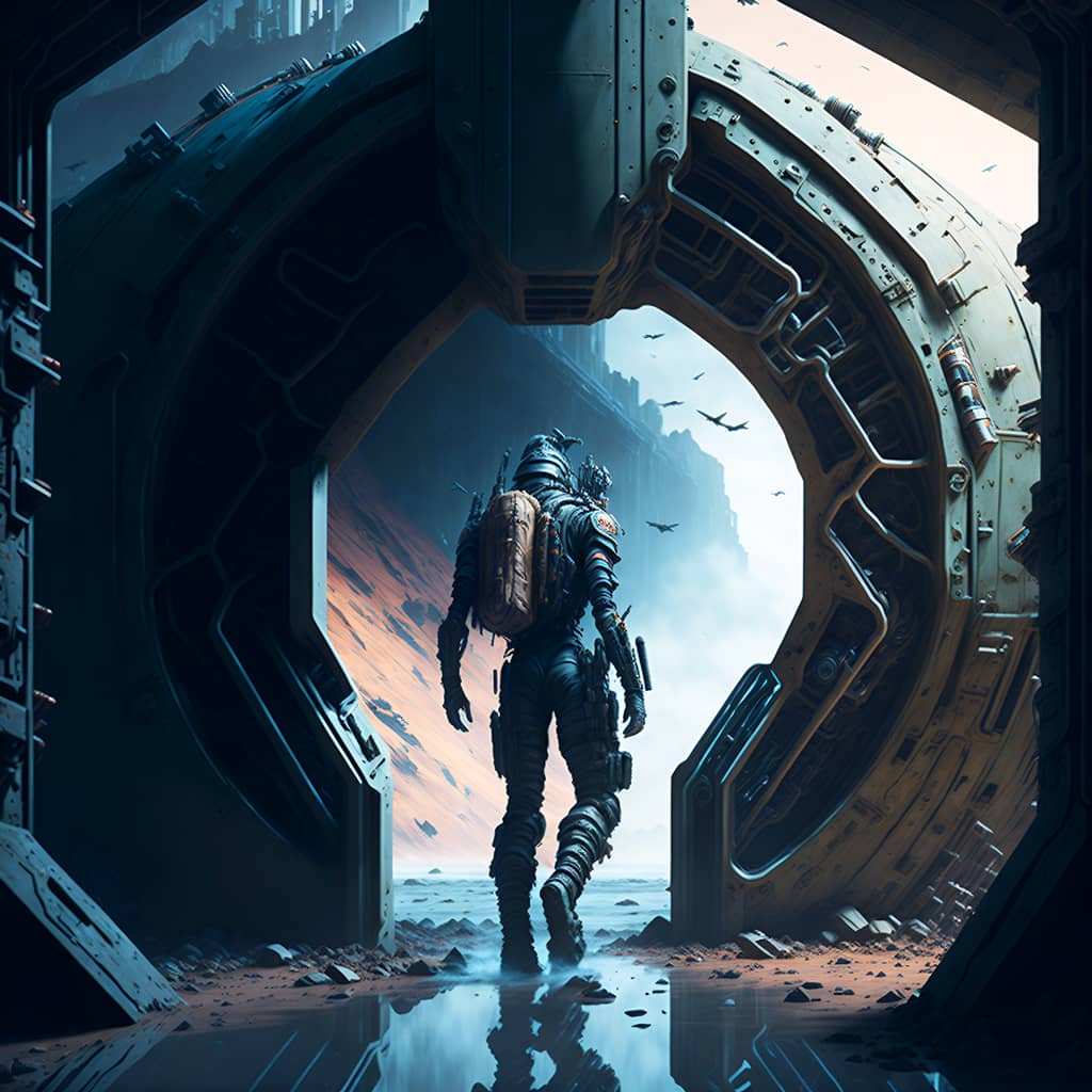 "The sound of my footsteps echoed through the deserted spaceship, the only company of the bloodied corpses of its former crew that lay strewn about the deck's cyborg in profile looking towards a portal to another dimension".