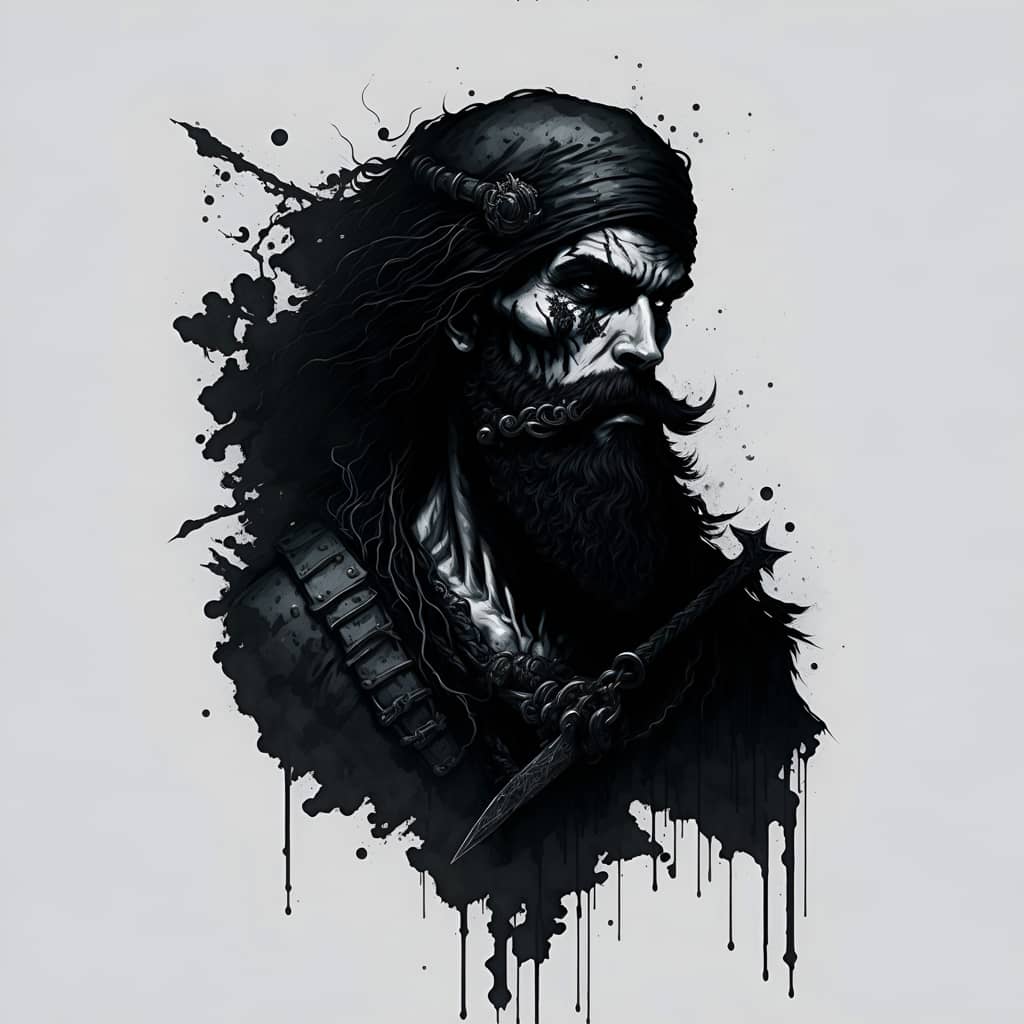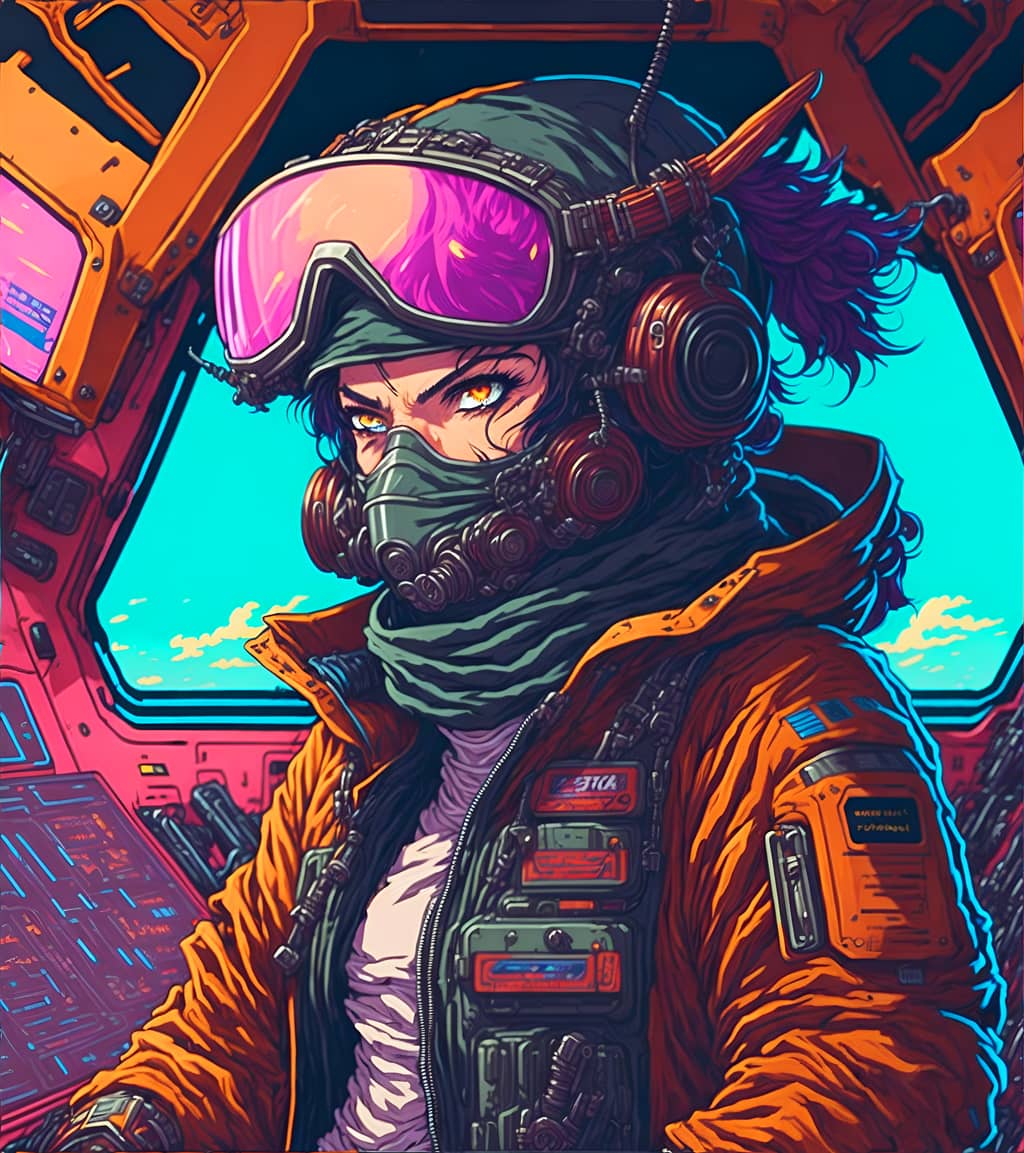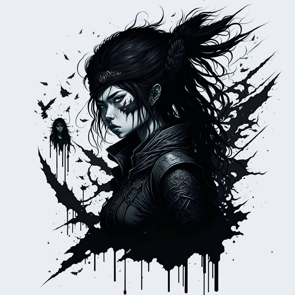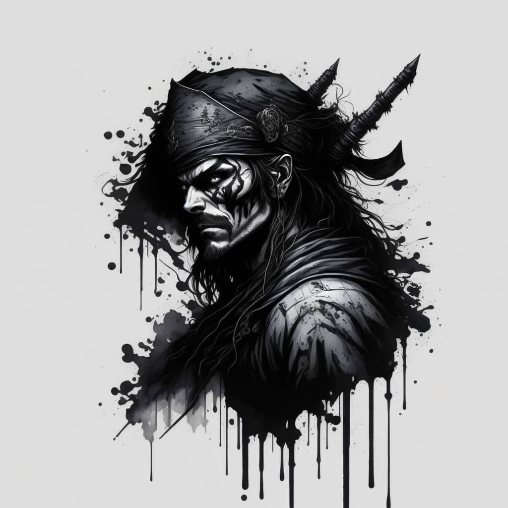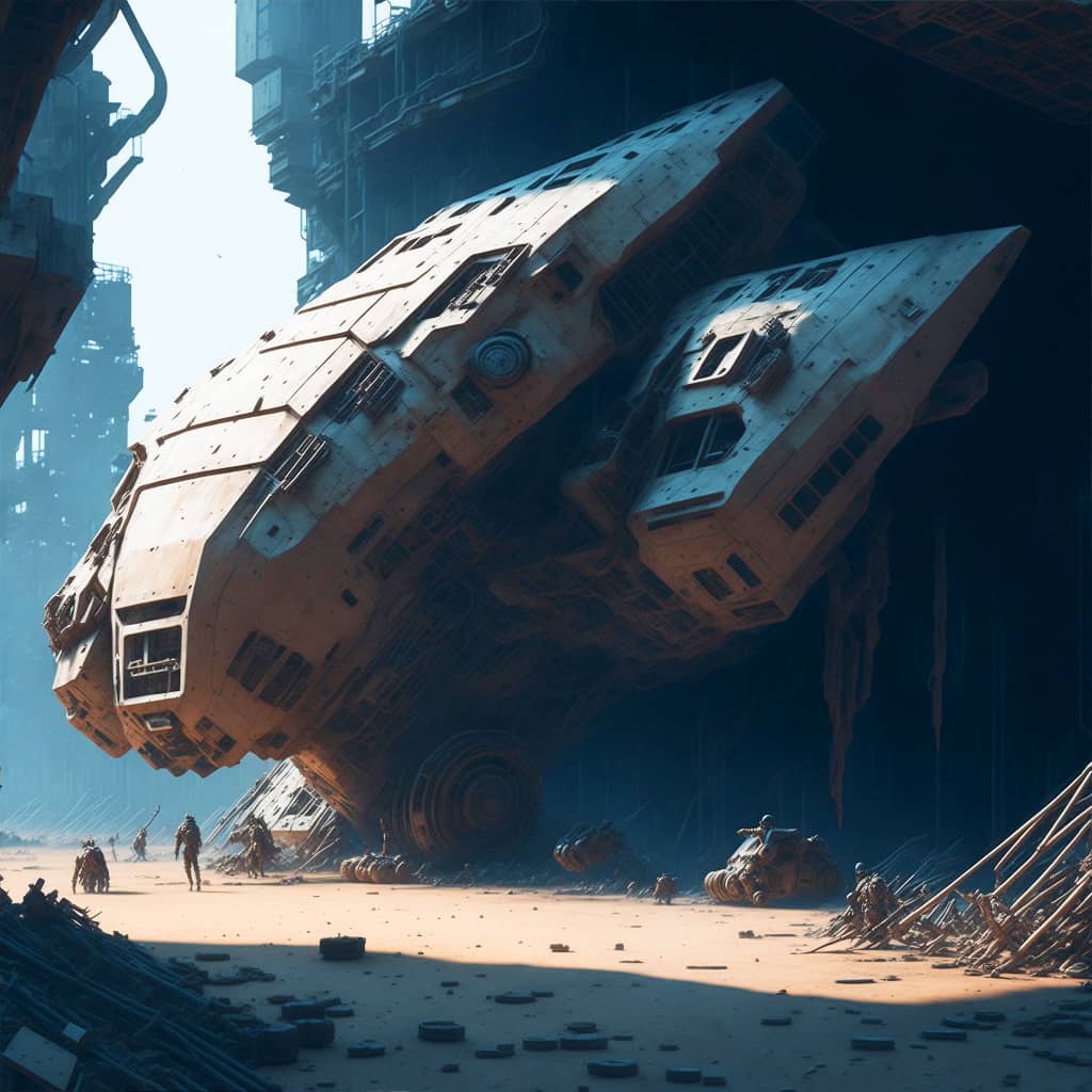 "The sound of my footsteps echoed through the deserted spaceship, the only company of the bloodied corpses of its former crew that lay strewn about the deck's cyborg in profile looking towards a portal to another dimension".