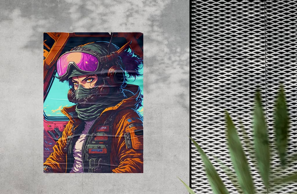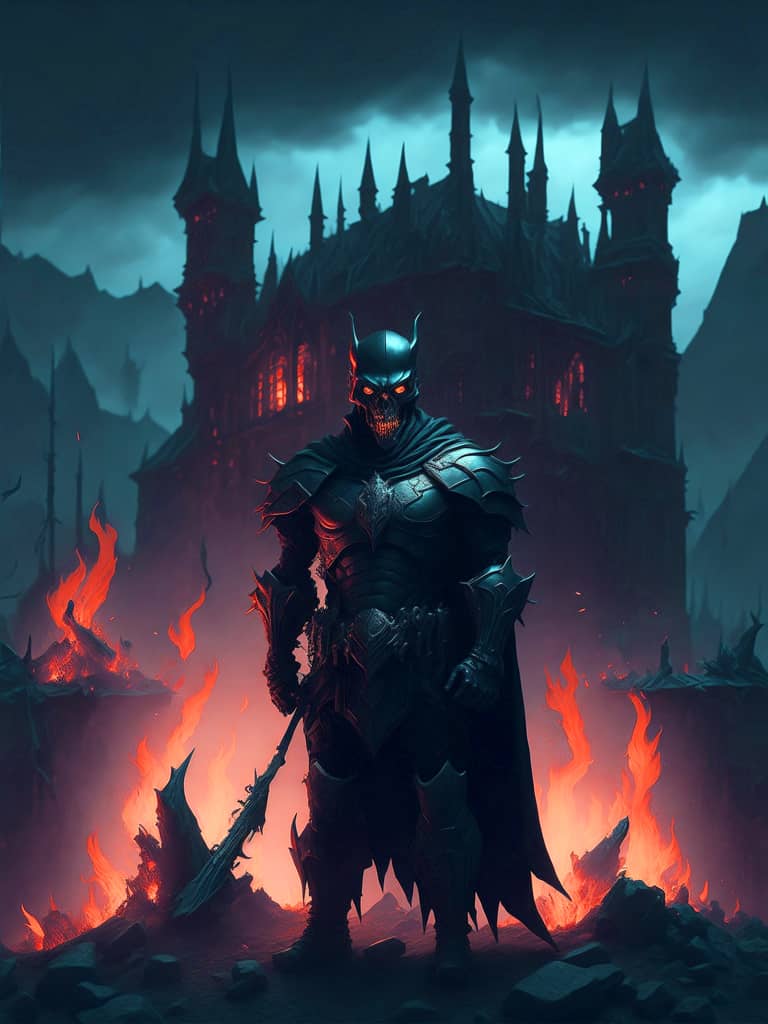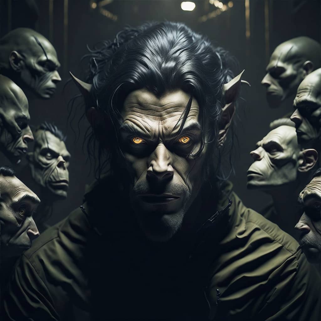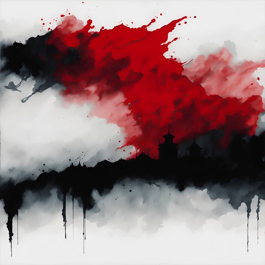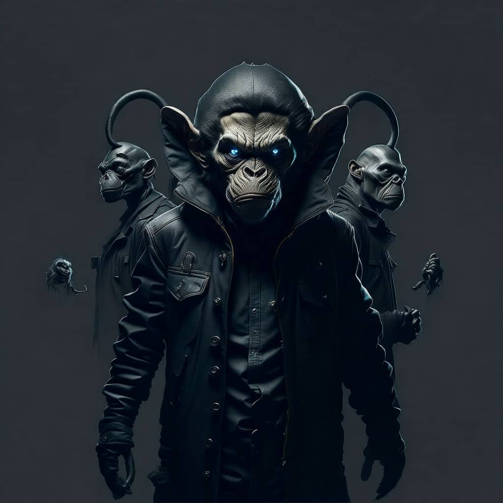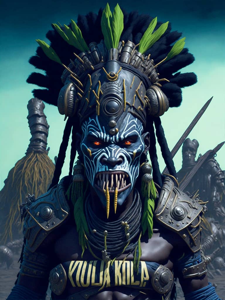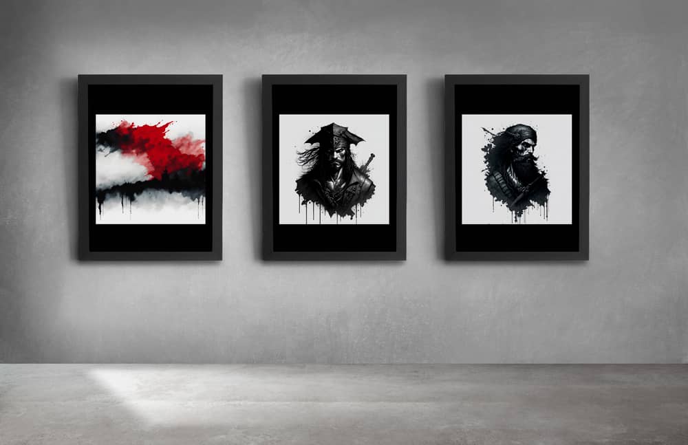 "The sound of my footsteps echoed through the deserted spaceship, the only company of the bloodied corpses of its former crew that lay strewn about the deck's cyborg in profile looking towards a portal to another dimension".